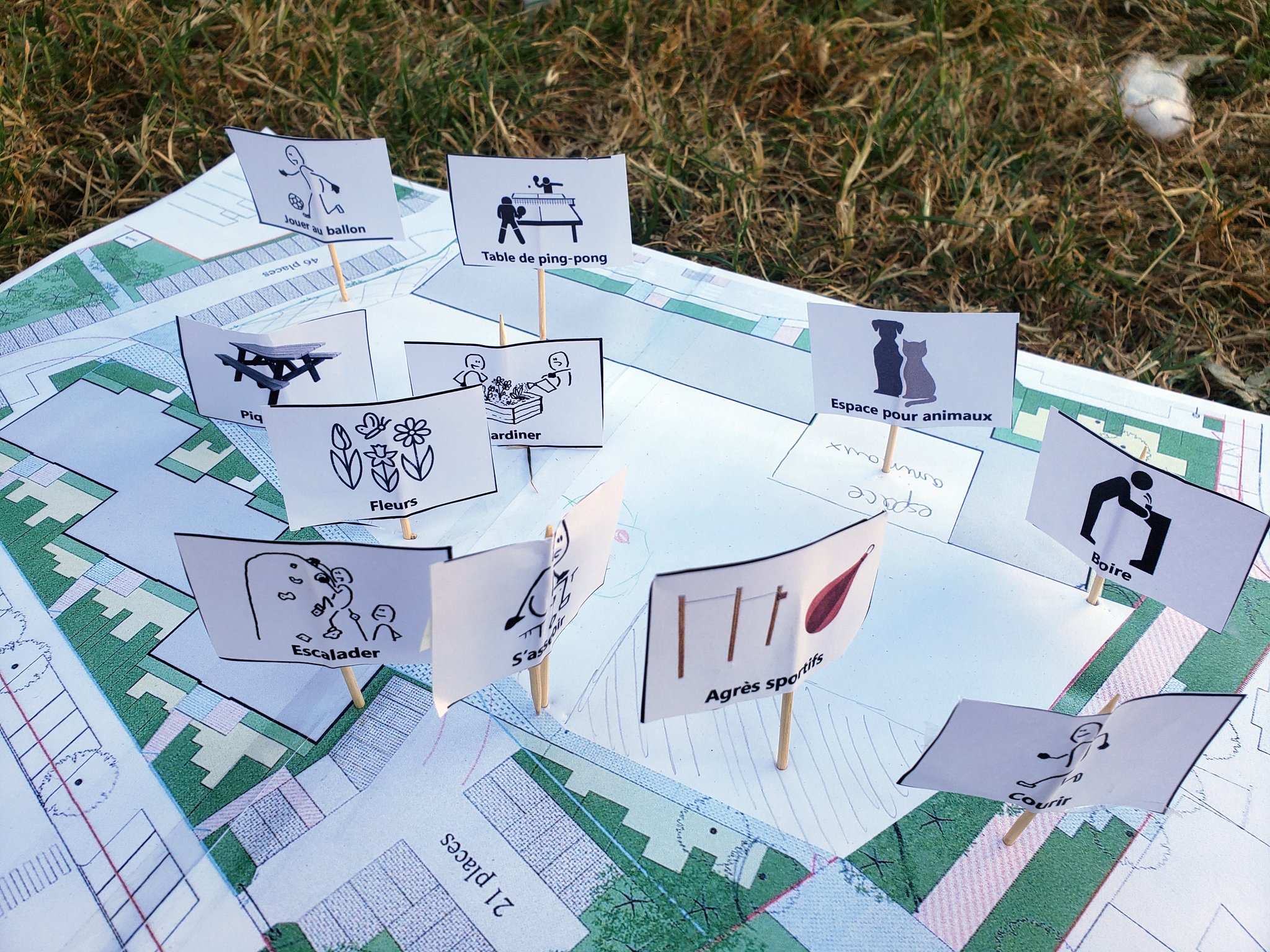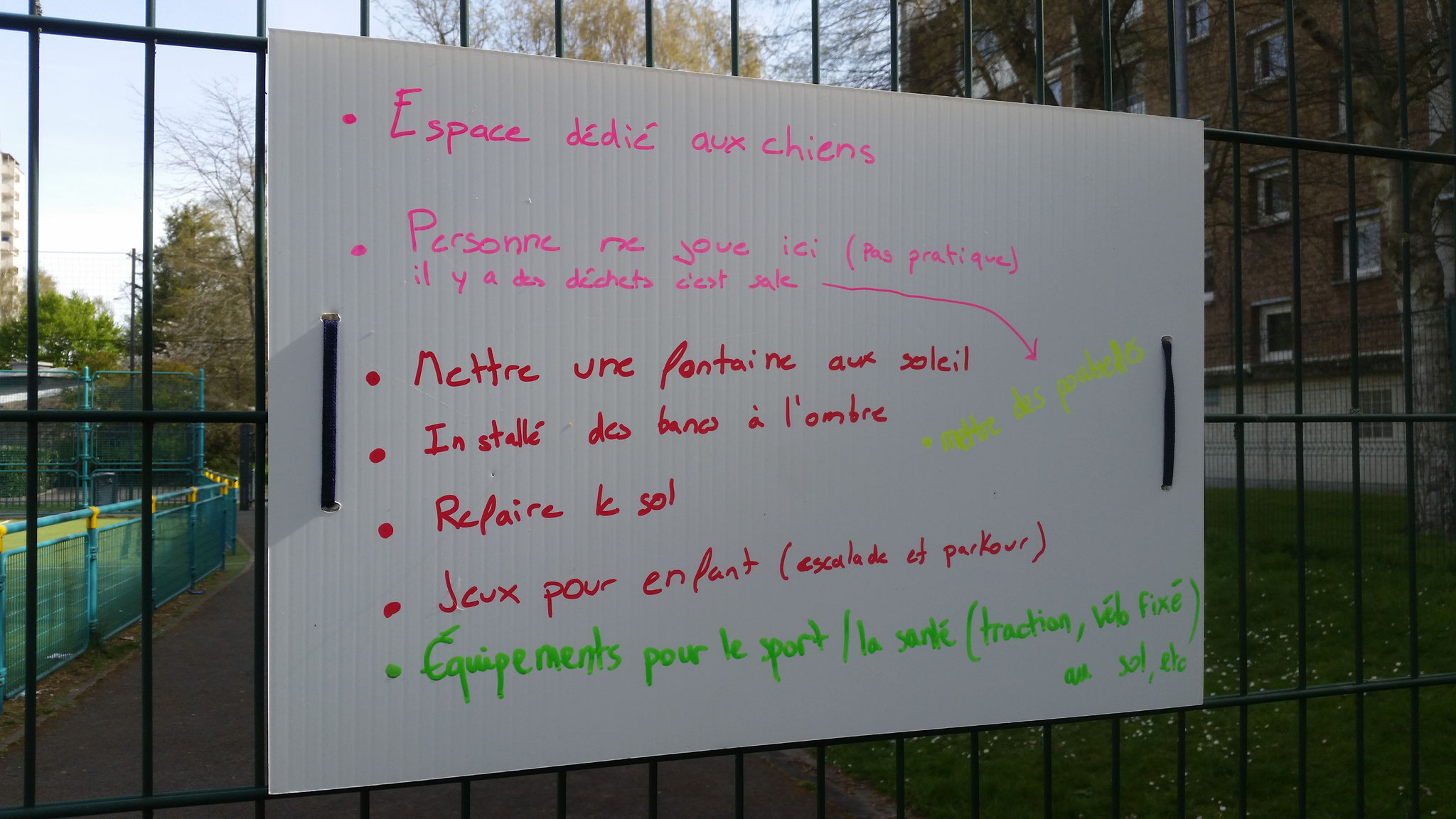 Après avoir réhabilité les logements et la façade de la tour Lecocq, le bailleur Vilogia a souhaité prolonger son implication jusque dans le réaménagement des espaces extérieurs. Les enfants et les jeunes résidents de la tour ont pu partager leur vision pour le futur du pied de l'immeuble ainsi que leurs souhaits afin de rendre les lieux plus agréables et plus jouables. Avec les pré-ados du centre social juste derrière la tour, nous avons proposé des aménagements pour l'ensemble de l'îlot.